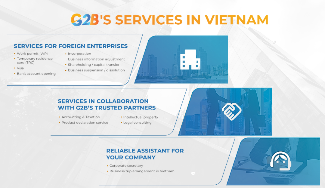 With G2B, you can streamline your setup process and focus on your core business activities. Our dedicated team is here to help you with all your needs. G2B services provide the best incorporation in Vietnam for company formation service, offering professional and reliable support, guiding businesses through proper company establishment and annual compliance, opening local/digital bank accounts, ensuring smooth operations, and minimizing legal risks from the outset.